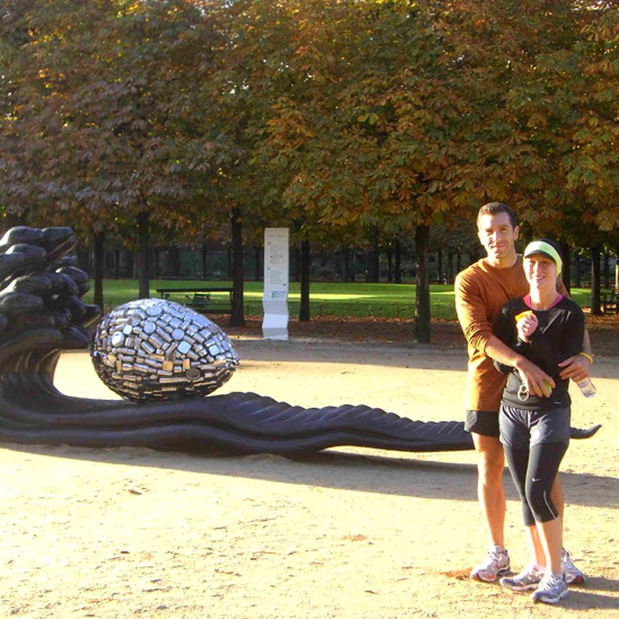 Ryan and Ginger – Chestnut trees and modern art in the garden of the Tuileries 7:59 AM With Ginger and Ryan from Austin, Texas, we had a 2 hours tour. Ginger and Ryan are preparing their first marathon, Saint Jude Memphis Marathon, beginning of December. We started from the Arc of Triumph, ran on the Avenue Foch (Finish of the Paris Marathon), went along the “Bois de Boulogne” lake, went back to Paris and finished the tour by the Champs Elysees (Start of the Paris Marathon!). On our way, crossing the Tuileries garden, we had the opportunity to enjoy some modern creations of the Contemporary Art International Exhibition (in French, FIAC, Foire Internationale d’Art Contemporain) which takes place every end of October. See the FIAC here and the Tuileries garden part here. Thank you Ginger and Ryan! Enjoy your first marathon! The route of the tour: You can display Ginger and Ryan’s tour on a bigger map