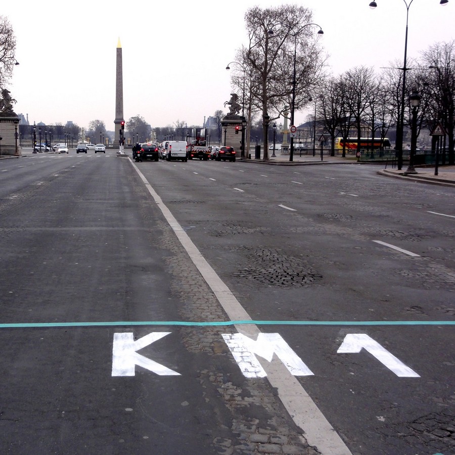 Champs-Elysées – Kilometer 1 – Just before “place de la Concorde” before turning left to the Rivoli street In spring, strange signs appear on the Parisian road, blue lines accompanied by indications which seem to be coded: “KM1”, “KM2”, “KM3”, etc. These are the kilometric marks of the Paris marathon! In other places, all the miles are indicated too. On the photo above, the first kilometer. Magic kilometer going down the Champs-Elysées. Imagine, you are in the middle of the road of one of the most beautiful avenues and you are running applauded by the crowd! Take care, in spite of the enthusiasm, don’t lose your head. If it seems to be easy, it is because you are running downhill. keep your energy. One kilometer earlier, the start, in the middle of the Champs-Elysées. The mark is already present: The 2013 Paris marathon start at the level of the Marbeuf street Here you are, ready to make a magnificent route in Paris. Find the route in detail by clicking the image below, with a view of monuments, buildings, streets: Having crossed and taken advantage of Paris up and down, here you are, very close to the finish, in the kilometer 42: Avenue Foch – 42th kilometer – In the background, the Arc of Triumph Only 195 meters to go (enjoy it, this moment is extraordinary) and you arrive! Here is the location of the finish, rather discreet for the moment: The finish line ! Behind the Arc of Triumph, the Champs-Elysées from where the Marathon started! We wish you a beautiful Paris Marathon!