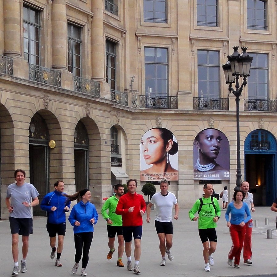Running Place Vendôme 9h43 – In this month of April, an important international company had an executive management meeting a few days in Paris. At the end of the working stay, a day of relaxation was dedicated to the visit of the capital. A sports tour of Paris was organized: there is nothing like running to fully relax. We, Vincent, Frédéric and Jean-Charles, accompanied the group of runners for a tour following the right and the left banks of the Seine, passing by the place Vendôme, the Tuileries, the Champs Elysées, the Eiffel Tower, the Louvre and the Opera Garnier. Thanks to them! In front of the Eiffel tower The Eiffel tower: Did you know it? From the beginning of the Eiffel Tower, five hydraulic elevators transported the visitors. In this time, for such a height and of such weights, it was a real technical exploit. For a long time, these elevators were driven by a pilot who was outside of the cabin. He bore the cold or the heat according to the seasons… A life-size reproduction of this pilot is on one of the elevators. Try to see him through the window of the elevator: Elevator pilot! The route of the tour :