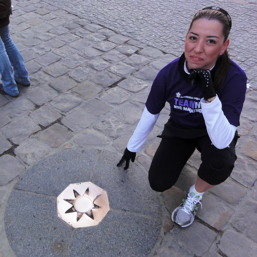 Elisa – Thomas Jefferson – Far off, the “Sacré-Coeur” 9:09 AM – Elisa, from Atlanta (USA), takes back the running having ended the New-York Marathon. On this Sunday of December, we chose a tour along the river Seine. On our road, we crossed Thomas Jefferson, a great friend of France, who liked Paris very much. He was in the same way as his French counterparts, a man of the “Enlightment” and succeeded Benjamin Franklin as Ambassador of United States in France. Thomas Jefferson enjoyed a lot the Architecture. Thomas Jefferson’s statue is, besides, situated just next to a building which he admired very much, the hotel of Salm, otherwise known under the name of the Legion of Honor Palace. This palace was often imitated. You can see, for example, a copy in the Lincoln Park, in San Francisco (USA). If you look closely at the photo with Elisa, quite at the bottom, you will see the “Sacré Coeur”, the very visible church because at the top of Montmartre, in the North of Paris. By running along the river, we may be under the impression to go straight on. By going East by the left bank (for example), at the level of the Bir Hakeim bridge, we can be surprised seeing the “Sacré Coeur” in front of us, while at the another moment, next to Thomas Jefferson for example, we will see it on our left. In Paris, the river Seine is a curve! Join the right bank by the Bir-Hakeim bridge, the “Sacré Coeur” will be on your right. By the footbridge Léopold-Sédar-Senghor, it will be in front of you. At the level of the towers of Notre-Dame, you will see it on your left. In Paris, the Seine is a curve! A little later, we joined the square of Notre-Dame. Have you already noticed on the ground, the point Zero of the roads of France? Elisa next to the point Zero of the roads of France Yes, indeed, Paris is a big city and it is necessary to have a precise point in Paris which serves as reference for the distances with the other cities. What is the distance between Versailles and Paris by road, for example? Not the one who meets a limit of Paris but the one who finishes in the point Zero: Between Versailles (the Castle) and the limit of Paris: approximately 14 km (in red), between Versailles (the Castle) and the zero point: approximately 23 km (in yellow) What about you? Where is the “point zero” of your city? Merci Elisa ! The route of the tour :