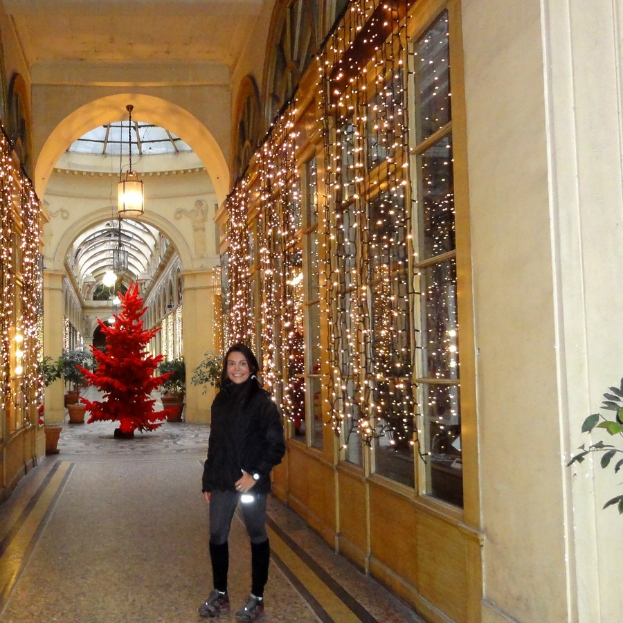 Ingrid – Galerie Vivienne 8h32 – Ingrid habite à Uberaba au Brésil. Pour débuter son séjour à Paris, Ingrid a choisi de faire un Paris Running Tour. Ce dimanche matin, deux jours avant Noël, Paris est tout décoré pour les fêtes. Comme on peut le voir ci-dessus, la belle Galerie Vivienne (1823), elle aussi, respecte la tradition. Notre course, dans ce Paris très calme d’un dimanche matin avant Noël, nous a permis de voir un Paris très varié : des passages (Galerie Vivienne, passage du Grand Cerf, passage du Bourg-L’abbé), le Paris de Napoléon 1er avec l’Arc du Carrousel, le Paris moderne avec le Centre Pompidou ou le Paris très ancien avec la maison de Nicolas Flamel. Ingrid – Maison de Nicolas Flamel La maison de Nicolas Flamel qui date de 1407 est la plus vieille de Paris (plus ancienne même que celles de la rue François Miron). Nicolas Flamel était un riche bourgeois qui avec son épouse Pernelle, fit construire des maisons pour accueillir les pauvres. Celle-ci, rue de Montmorency, est la dernière qui existe. Une inscription indique les prières que devaient faire les habitants du lieu : « Nous homes et femes laboureurs demourans ou porche de ceste maison qui fut faite en l’an de grâce mil quatre cens et sept somes tenus chascun en droit soy dire tous les jours une paternostre et un ave maria en priant Dieu que sa grâce face pardon aus povres pescheurs trespasses Amen« . C’est actuellement une auberge. Quelques foulées plus loin, c’est le Paris moderne que nous découvrons. Ingrid – Centre Pompidou – « Le coup de tête de Zinedine Zidane » Oeuvre de Adel Abdessemed Effectivement, nous retrouvons le Centre Pompidou, l’un des plus grands centres d’Art Contemporain mondiaux. Il accueille actuellement une exposition temporaire de l’artiste Adel Abdessemed. On peut voir sur le parvis une sculpture (provocatrice ?) représentant le coup de tête donné par le célèbre footballeur Zinedine Zidane à un adversaire aux mots un peu déplacés… Ingrid – Arc du Carrousel Nous avons déjà parlé de l’Arc du Carrousel lors d’un tour avec Kristy.  Aviez-vous remarqué le quadrige en haut de l’Arc ?  En fait, la sculpture est une copie. Napoléon 1er avait pris la statue originale aux Vénitiens qui eux-mêmes l’avait dérobée lors du sac de Constantinople en 1204 (les Chevaux datent de l’an 330 et furent érigés par l’Empereur Constantin). A la chute de Napoléon, les chevaux originaux furent rendus à Venise où vous pouvez les admirer place Saint-Marc.  Pour finir, voici une petite carte postale avec d’autres beaux endroits vus lors de notre visite : Joyeux Noël à toutes et à tous ! Merci Ingrid ! Le circuit du tour :