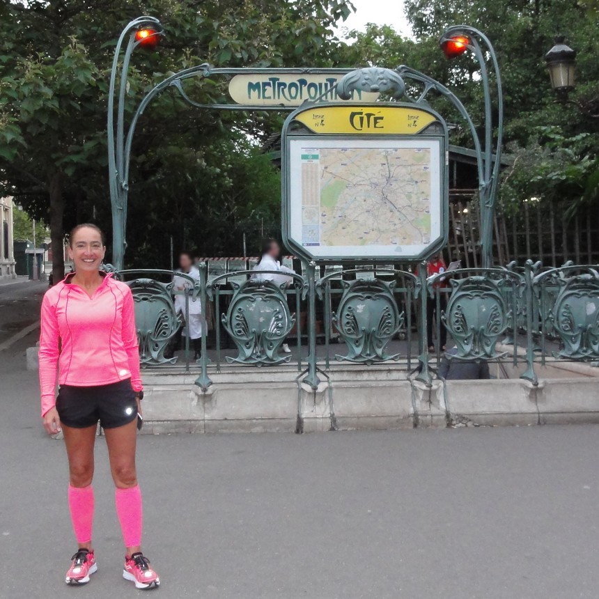 Lysa – Ile de la Cité 7h03 – Avec Lysa, de Buffalo (état de New York), nous avons fait un circuit de 10 miles (16 kilomètres) pour découvrir les nombreuses facettes artistiques de Paris. Plus de 2000 ans d’Histoire… et de créations artistiques et architecturales ! Avez-vous remarqué les nombreuses bouches de métro parisiennes avec ces formes en arabesques, comme celle que l’on voit sur la photo ci-dessus à côté de Lysa ? Ces « édicules » sont typiques des créations artistiques du début du 20ième siècle, cet art que l’on a appelé l’Art Nouveau. Le créateur, Hector Guimard, artiste très représentatif du mouvement Art Nouveau, a réalisé près de 141 de ces entrées du métro Parisien de 1900 à 1912. Certains édicules sont même recouverts d’un toit vitré. Il n’en reste aujourd’hui que 86 dont 2 avec un toit vitré comme celui de la porte Dauphine : Des édicules d’Hector Guimard ont été offerts aux métros d’autres villes, Montréal, Mexico, Chicago, etc. Il en existe même un à la National Gallery of Art de Washington. Toujours sur l’Ile de Cité, nous avons aussi admiré deux exemples de l’Art Médiéval (vaste ensemble des Arts du Moyen Age, sur une période de 1000 ans…) : La fameuse Cathédrale Notre Dame de Paris, représentative de l’Art Gothique : Lysa et la Cathédrale Notre Dame de Paris (à gauche, les installations temporaires célébrant les 850 ans de Notre Dame) L’Horloge de la Conciergerie (pour plus d’informations, lire cet article) : Lysa – Tour de l’Horloge Plus à l’Ouest, c’est deux formes d’arts plus récents que nous avons rencontrées : Un mur végétal ! L’un des premiers murs végétalisés réalisés par Patrick Blanc, qui a inventé le concept de murs végétaux. Celui-ci fut créé en 2004, sur le mur d’un bâtiment administratif du musée du Quai Branly : Lysa – Mur végétalisé (Patrick Blanc 2004) Et bien sûr, la fameuse Tour de fer, la Tour Eiffel ! La Tour fut construite pour l’exposition universelle de 1889. De 1889 à 1931, ce fut le monument le plus élevé du monde. Lors de sa construction, elle fut très critiquée, mais obtint un grand succès lors de l’exposition de 1889, succès qui retomba assez vite (malgré un regain de curiosité lors de l’exposition universelle de 1900…) On envisagea même de la détruire… C’est maintenant le symbole le plus emblématique de Paris ! Lysa – Tour Eiffel Le plaisir de pouvoir courir à Paris ! Merci Lysa ! Le circuit du tour :