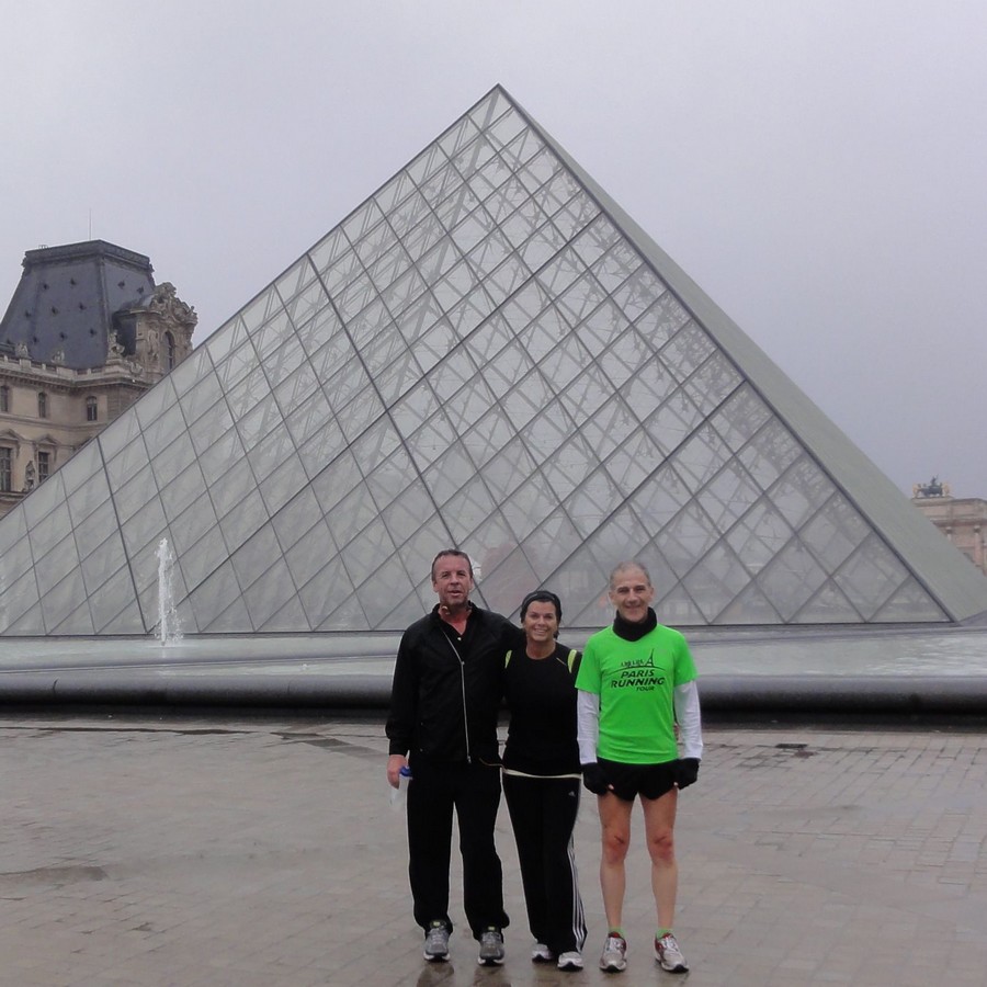 Pyramide du Louvre – Nigel, Karen et Jean-Charles 8:06 – Avec Karen et Nigel du Royaume-Uni, nous sommes partis du quartier de l’Opéra pour faire un circuit le long du fleuve. Karen et Nigel ont fini avec succès le semi-marathon de Brighton la semaine passée. Nous avons couru à un bon rythme cependant sans considération pour la pluie que nous avons eue à Paris ce matin. L’itinéraire que nous avons pris nous a permis de constater que beaucoup de lieux parisiens partagent le classicisme et la modernité avec harmonie. Par exemple, dans le quartier du Louvre, nous avons apprécié la pyramide du Louvre, qui a été créée de façon respecter à les anciens bâtiments environnants. Pas très loin, au Palais Royal, nous vîmes les Colonnes de Buren, un autre exemple d’art moderne intégrant un environnement classique (il y eut une forte contreverse au moment de sa création mais, à Paris Running Tour, nous aimons cette combinaison…) En traversant le passage du Louvre conduisant au Palais Royal, nous avons eu la chance d’apercevoir des salles du Louvre présentant un autre mélange d’art moderne et d’art classique : l’exposition temporaire de Tony Cragg, qui a juxtaposé ses sculptures modernes aux classiques. Merci Karen et Nigel ! « Red figure » – Tony Cragg – 2008 (sur la droite 😉 Le parcours :