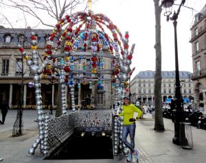Cette oeuvre d’art sert de bouche de métro à la station Palais Royal. Si vous allez au Palais Royal, comparez-là à l’autre sortie du même métro, située à 100 mètres de là, devant le Louvre, en style « Art Nouveau », créée dans les années 1900, modernité de l’époque…