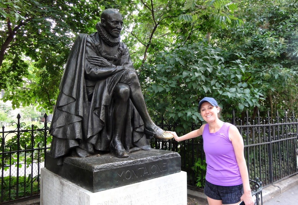 The story is funny. The students actually come to caress the foot of the philosopher Montaigne and formulate a wish (success in the examinations thanks to the knowledge of Montaigne?).